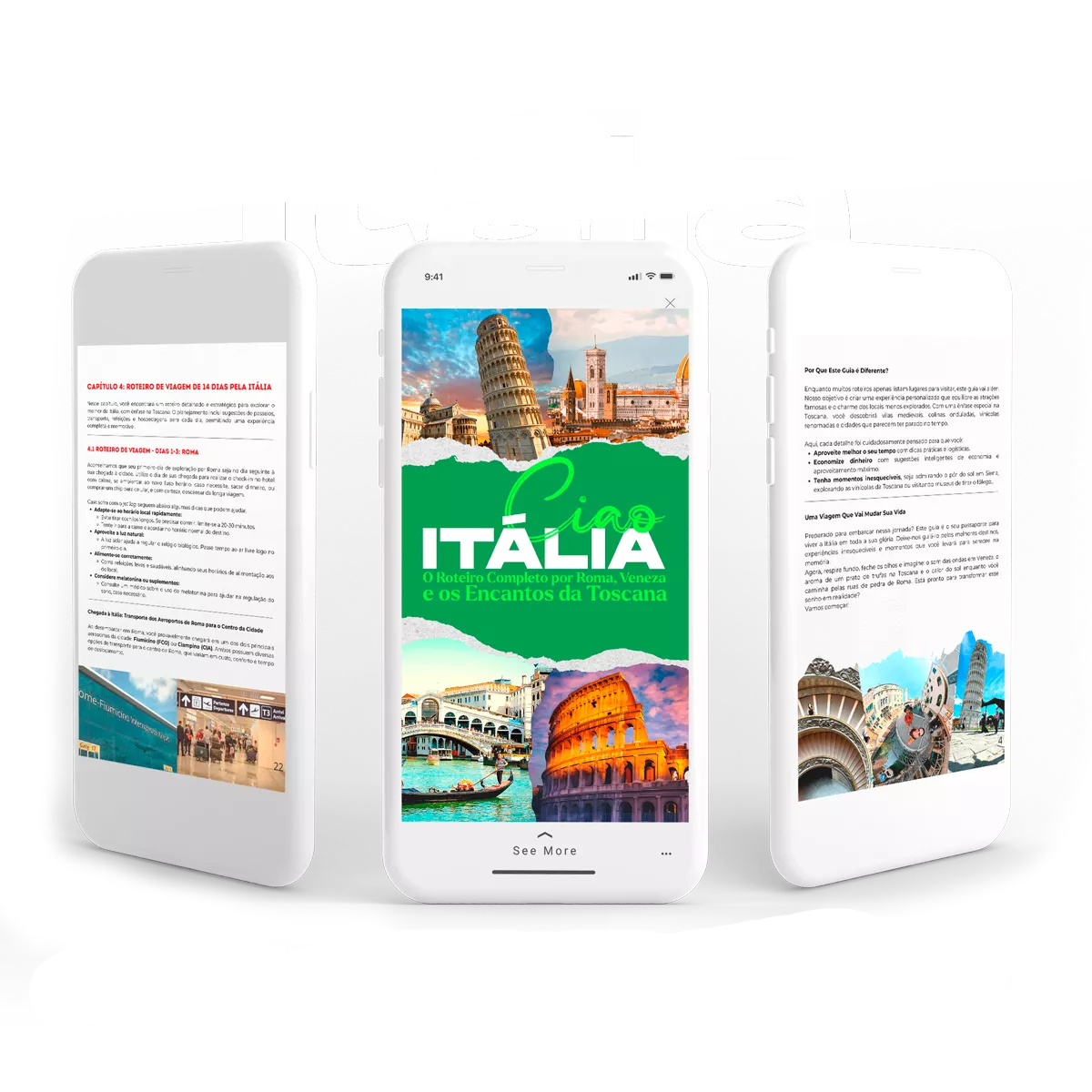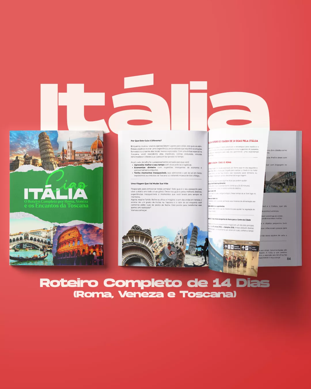 Nesse ebook, além de um roteiro completo de 14 dias pelas cidades de Roma, Veneza, e cidades da Toscana, com todos os detalhes possíveis, você irá encontrar todas as informações necessárias do que fazer antes de embarcar, dicas de como conseguir a melhor passagem aérea, informações sobre imigração, dicas de hospedagem de várias categorias, transporte e deslocamento, restaurantes e comidas típicas, passeios e ingressos, e muito mais.